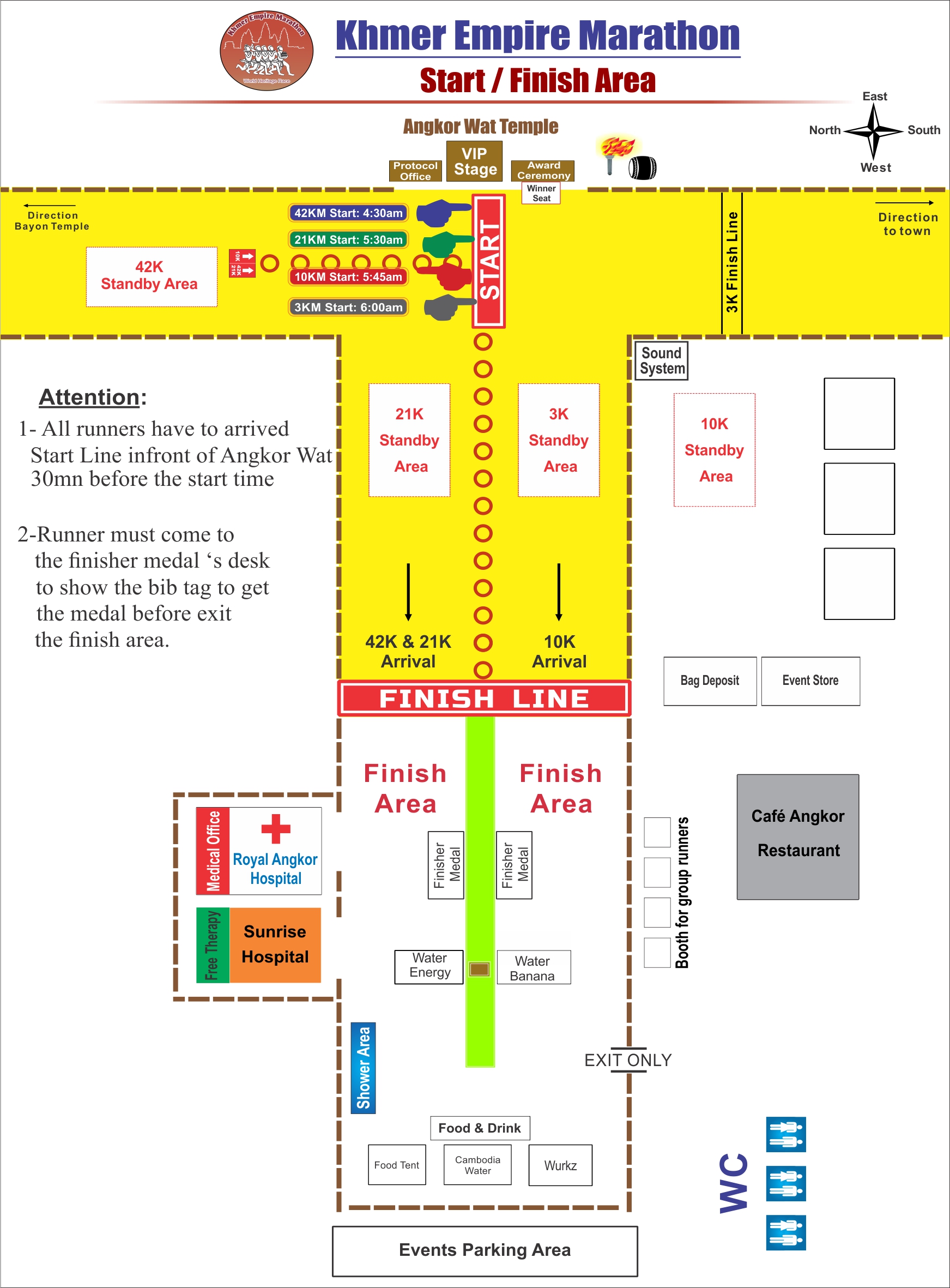 From the Siem Reap town to the Angkor Wat temple (start point) around 6km .It takes 20 minutes by Motor Remoque (Tuk Tuk) and 15minutes by Taxi or Bus. All participants of Khmer Empire Marathon must arrive the event place at least 30minutes before the starting time.