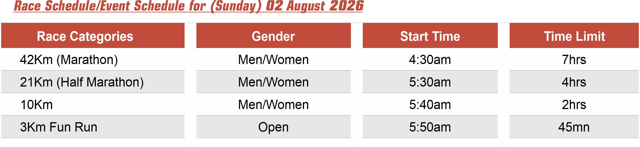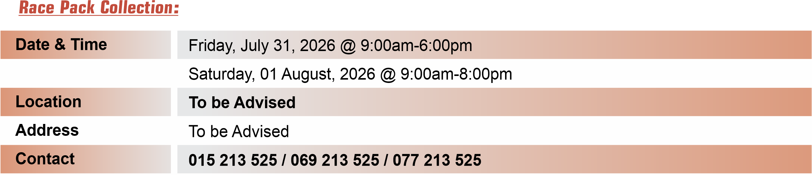 * Minority who participates in Kids race need the guardian’s signature on the Waver Clause at the final confirmation site at (To be Advised) from 31 July - 01 August 2026 (@ 9:00am - 6:00am)