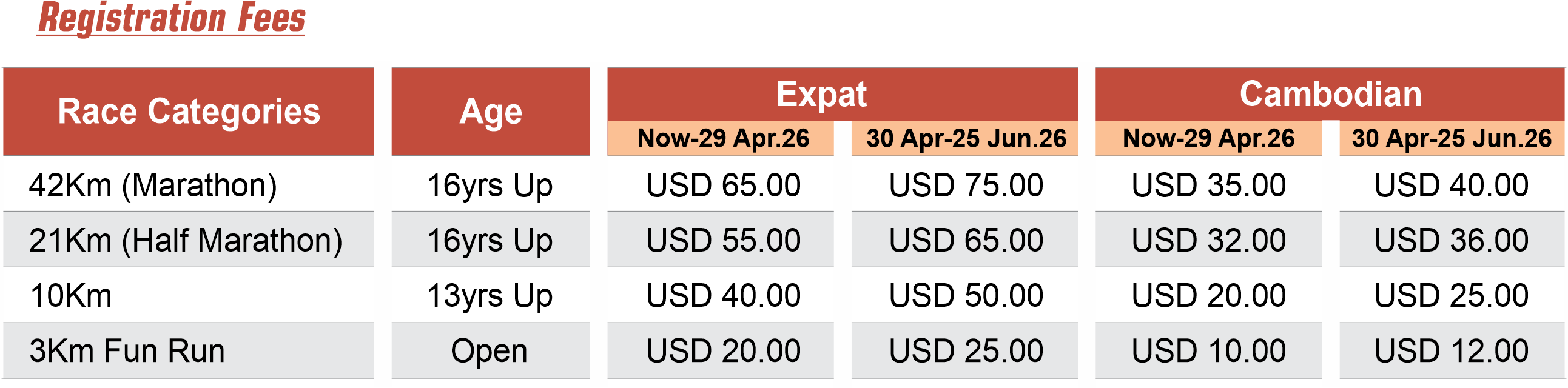 From the Siem Reap town to the Angkor Wat temple (start point) around 6km. It takes 20 minutes by Motor Remoque (Tuk Tuk) and 15 minutes by Taxi or Bus. All participants of Angkor Empire Marathon must arrive the event place at least 30minutes before the starting time.