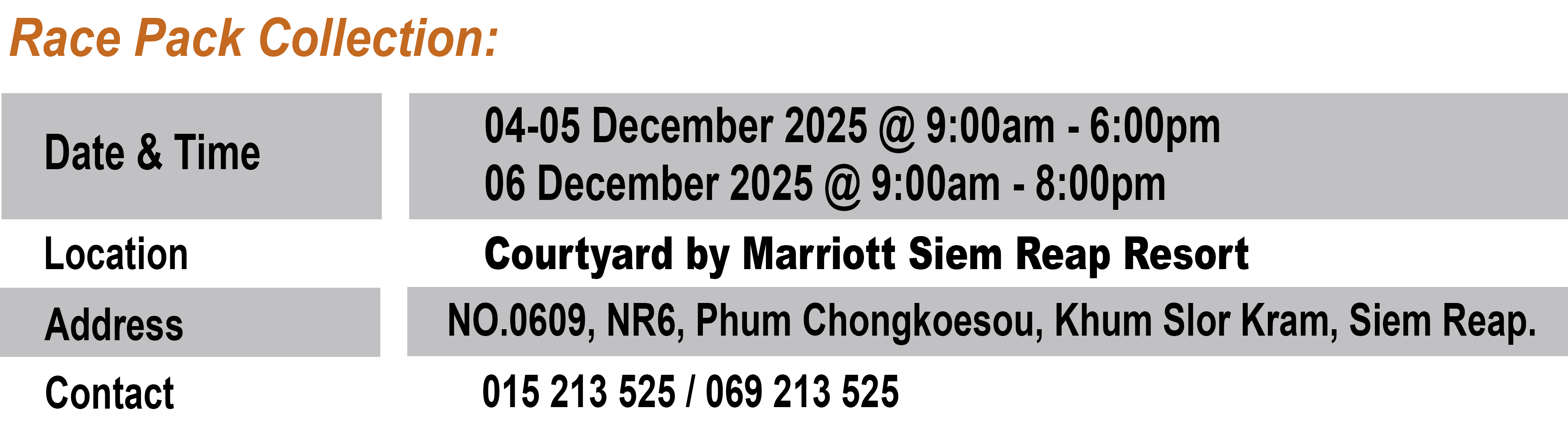 • Exhibition for Race Packs pick up: Conference Hall of Courtyard by Marriott Siem Reap Resort. From: 04th to 06th December 2025.