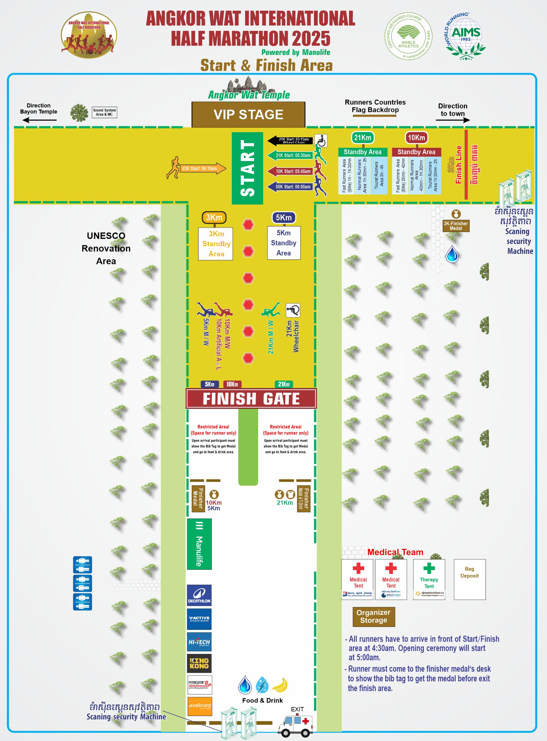 - Every runner will get ID pass from Marathon Committee on the date of race pack collection at Courtyard by Marriott Siem Reap Resort in Siem Reap from 04-06 December 2025.  This ID Pass will be permitted for free entrance to Angkor Area to check the running course on 04 - 06 December 2025, but not .allowed to go inside the temples.