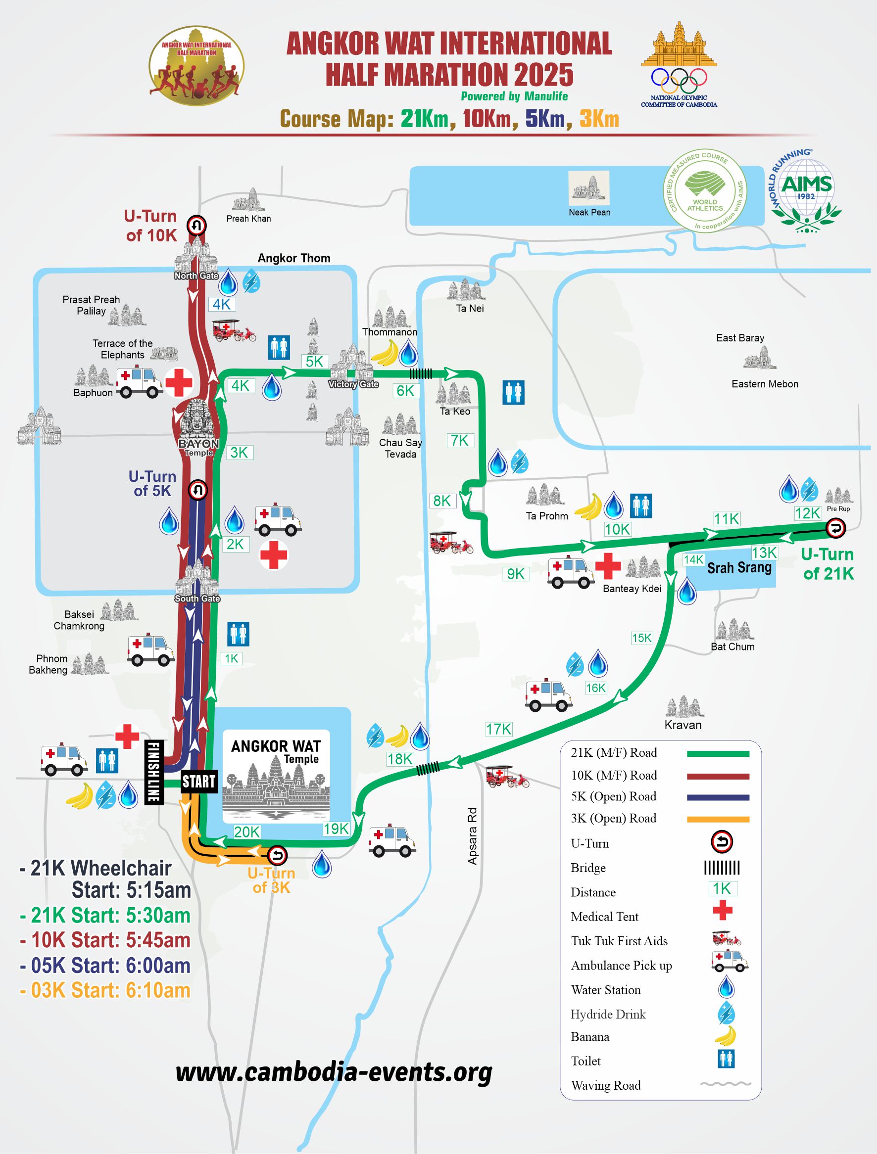 - Check points for the Bib tag timing was set up near Angkor Wat and Angkor Thom area.