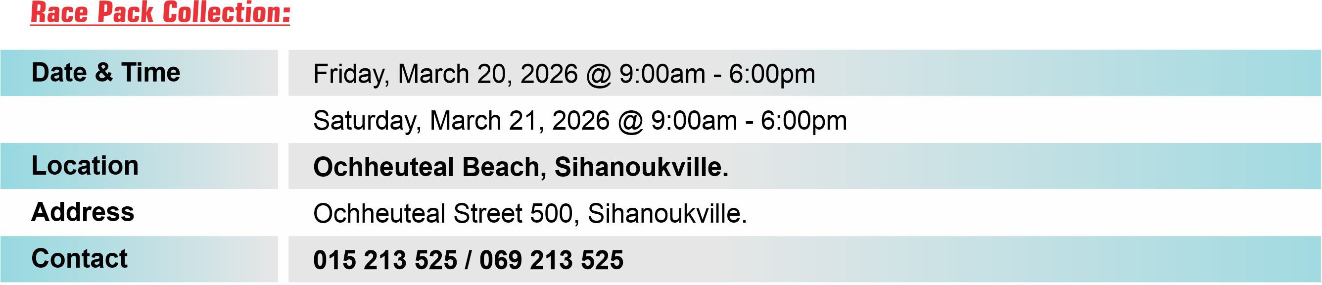 • Exhibition for Race Packs pick up: Booth at Ochheuteal Beach, Sihanoukville. From: 28 - 29 March 2025 (@9:00am - 6:00pm).